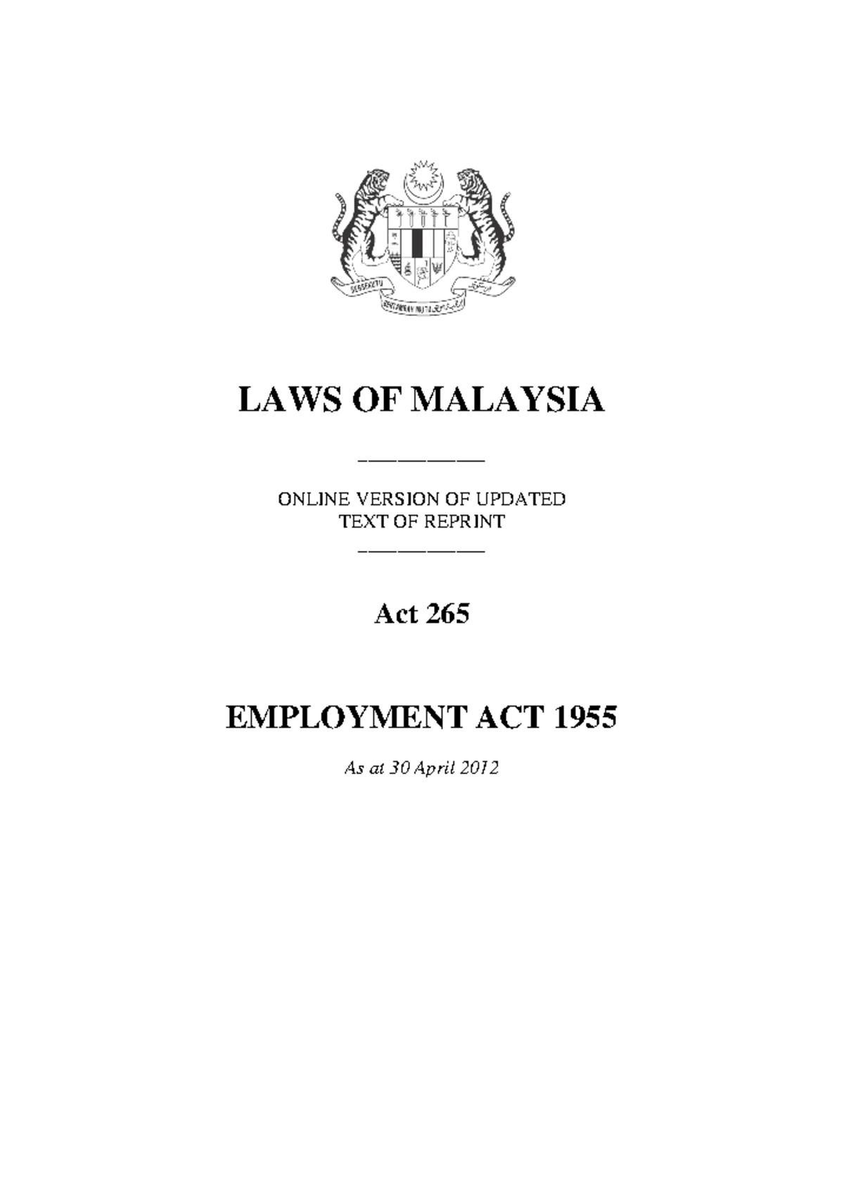 Employment Act 1955 Act 265 Malaysian Labour Laws